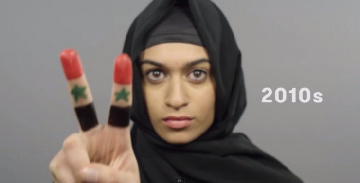 In the last 100 years, this nation has experienced different political regimes. For example, in 1930, Syria was a French colony. So over time, the European influence became the norm. A little later in the video, you can see that the model is wearing pearl earrings, pink lipstick and a fairly modern haircut.