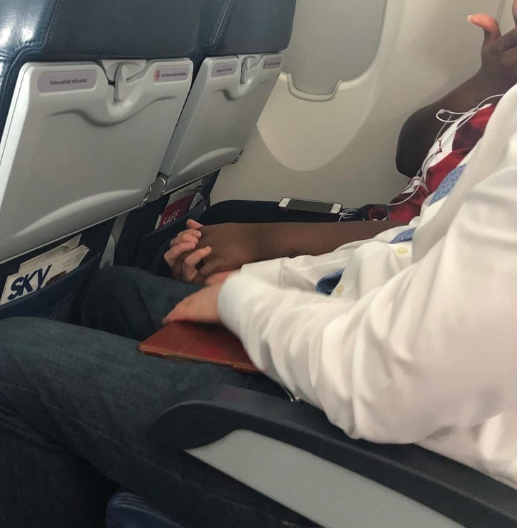 10. These two are strangers... The woman is scared of flying, so the man next to her held her hand to help her calm down.