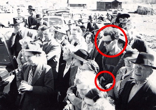 This photo was taken in 1941 at the inauguration of Gold Bridge in Canada. In the crowd you'll see a man wearing surprisingly modern clothes that don't look anything like 1940's fashion. Look closely and you'll see he's wearing a hoodie, a printed T-shirt and black sunglasses. He also appears to holding a modern camera.