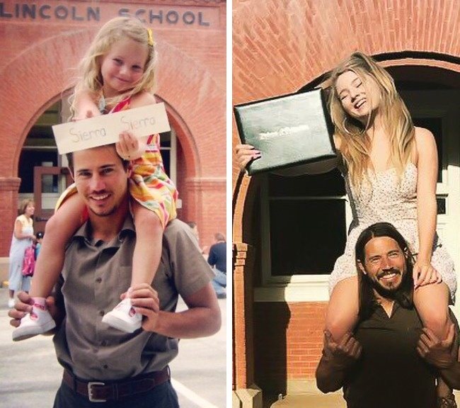 10. This dad carried his daughter on his shoulders for her first day at school and then did the same on her last day!