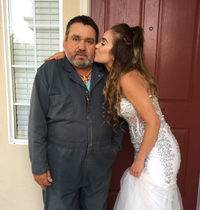 13. This girl's dad was stuck at work on her prom night. So, she put on her prom dress the next day, so they could have a dad and daughter photo!