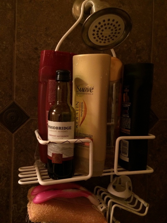 This woman wondered why her husband was spending so much time in the shower. A bottle of Cabernet Sauvignon gave the game away!