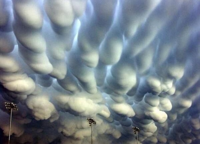 Extremely rare mammatus clouds can appear after violent storms, when air masses move in different directions and form huge, bolder-like clouds. But don't panic - their density and color may look menacing and scary, but rest assured that the sky's not about to fall on your head!