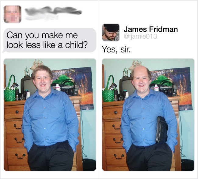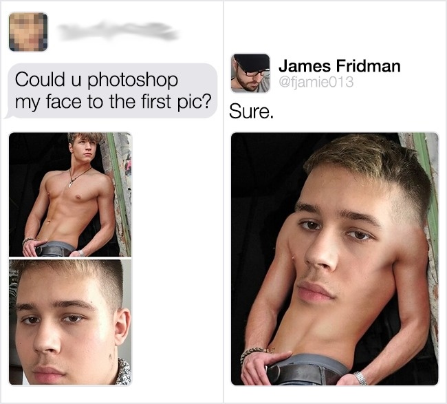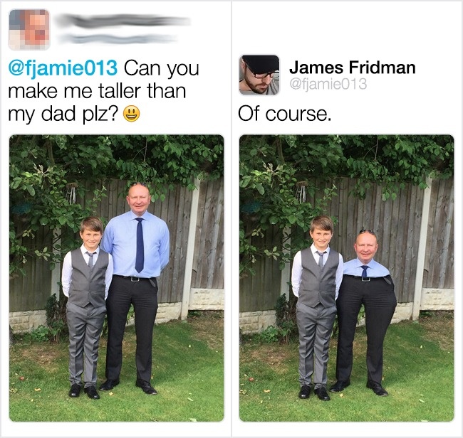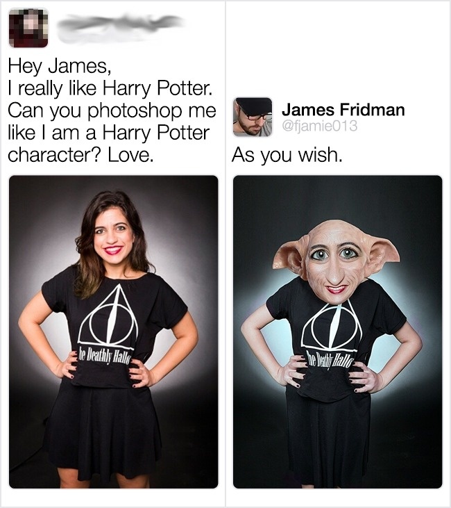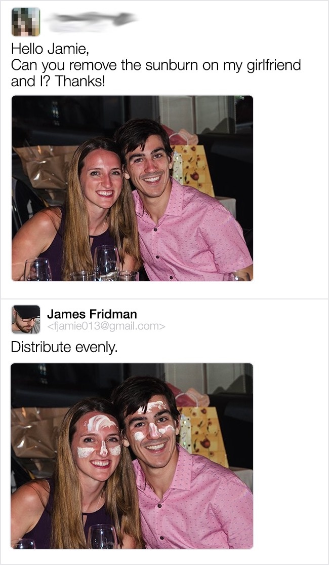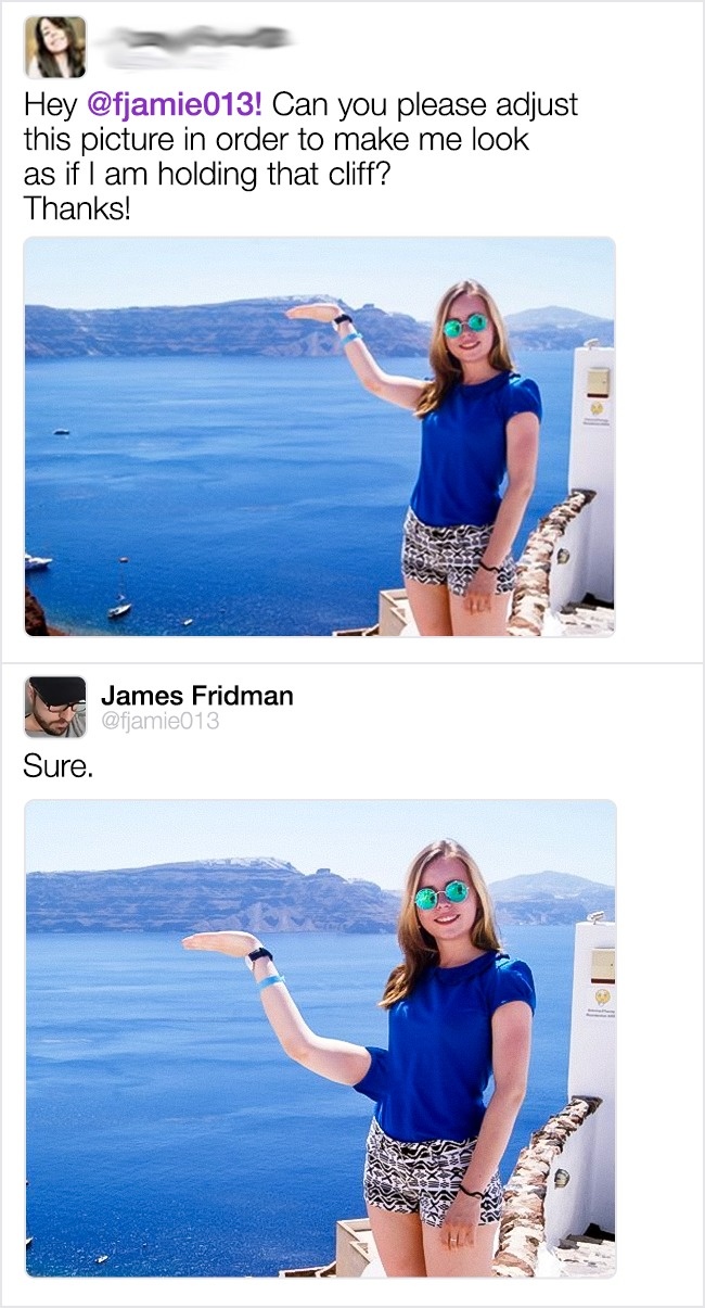 Most of us have heard of James Fridman, a Brit who's become the King of Photoshop Trolling. Just be prepared for a surprise if you ask him to retouch a snap, as he tends to follow instructions down to the letter, much to the delight of his fans (and us)! If you need his magic touch, just post your shot on his Twitter page and then wait for the results - bearing in mind that all retouched photos are made public and may well go down in internet history!