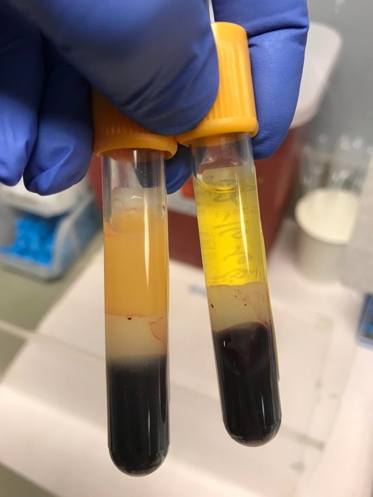 3. To find out a blood group type, doctors mix red blood cells with specific antibodies. In this case a blood type B will stick to the antibodies in the solution "B".