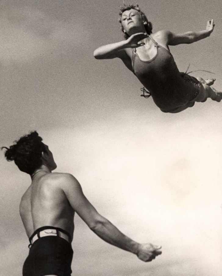 12. 1937 in Holland and a man prepares to catch a woman diving into a pool