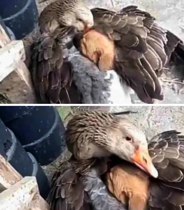 4. This goose didn’t hesitate to warm up a little lost puppy!