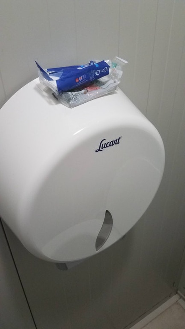 9. This bathroom ran out of toilet paper, so someone left their tissues.