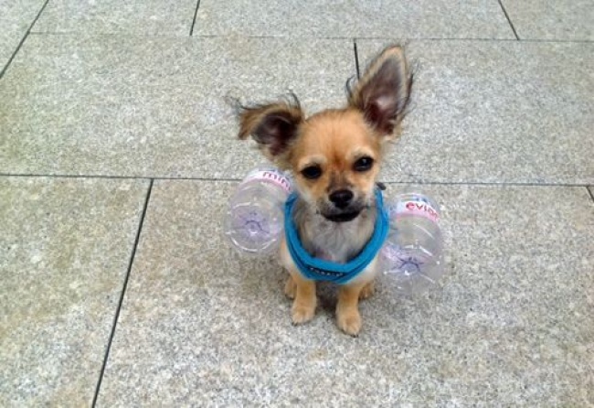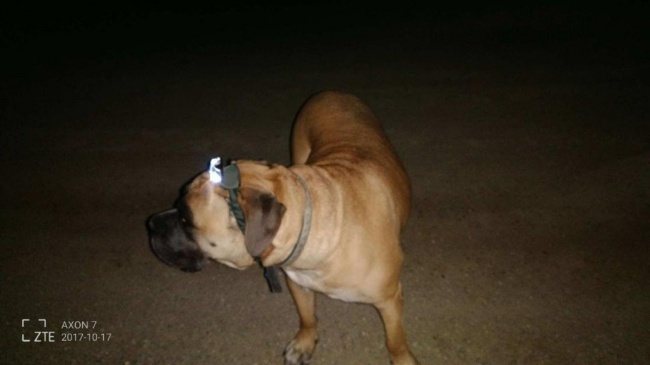 7. Despite its size, this dog's scared of the dark, so his owners fitted him with a 'head lamp'.