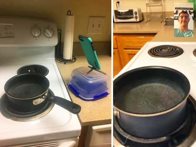 1. This guy needed to boil some water, but didn't want to be stuck in the kitchen. His solution? To FaceTime the pan, so he could watch TV in another room!