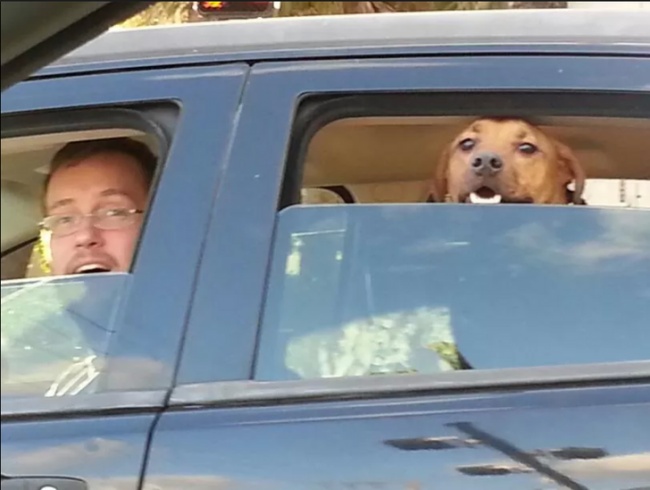 14. This man and his dog were caught watching a pretty woman walk her pooch.