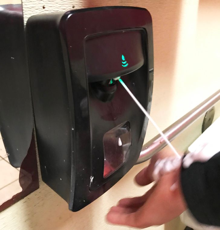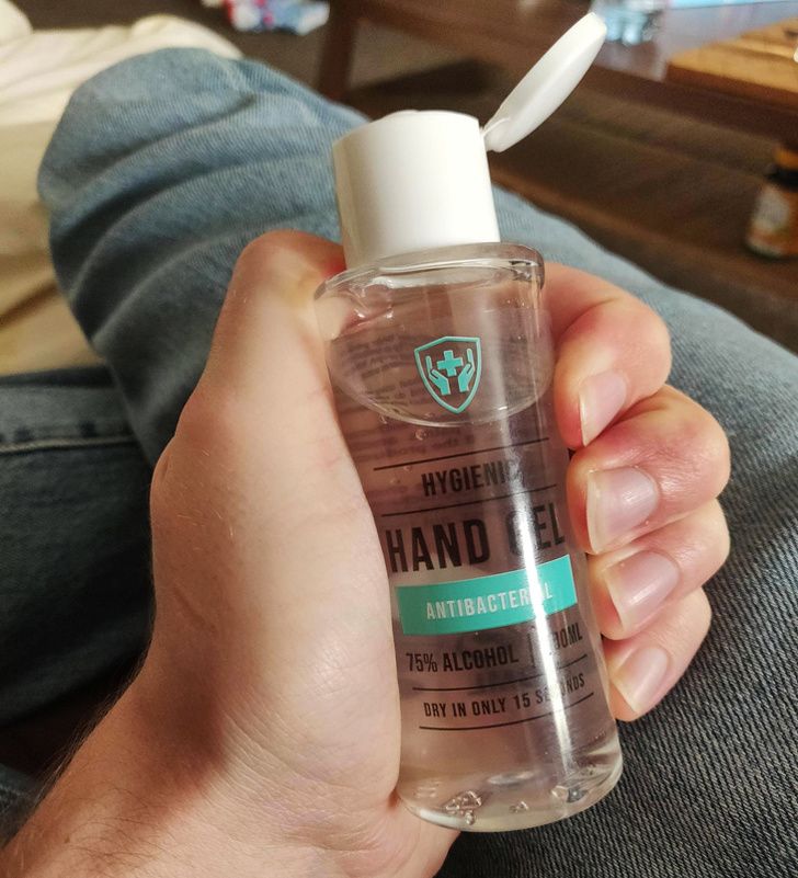 17. A hard plastic sanitizer bottle that is too hard to squeeze to get the sanitizer out