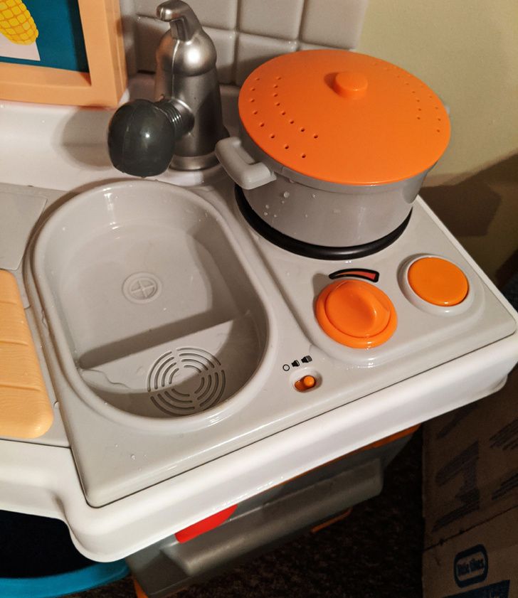 14. A plastic kid's stove has a speaker in the sink that no longer works after you put water in it.