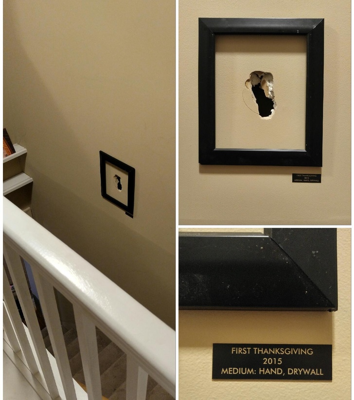 2. When your son knocks a hole in the wall, the best solution is to frame it to make it look like a masterpiece!