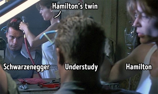 Any object that causes a reflection can be difficult for cameramen to handle, because the camera could be seen. So cameramen have to put themselves at a certain angle so they won’t be seen in the reflection. James Cameron found an interesting way to get around this in Terminator. As you can see, he used Schwarzenegger’s understudy and Hamilton to film the scene, and the actor himself with Hamilton's twin sister to film the reflection of the scene. Great art!