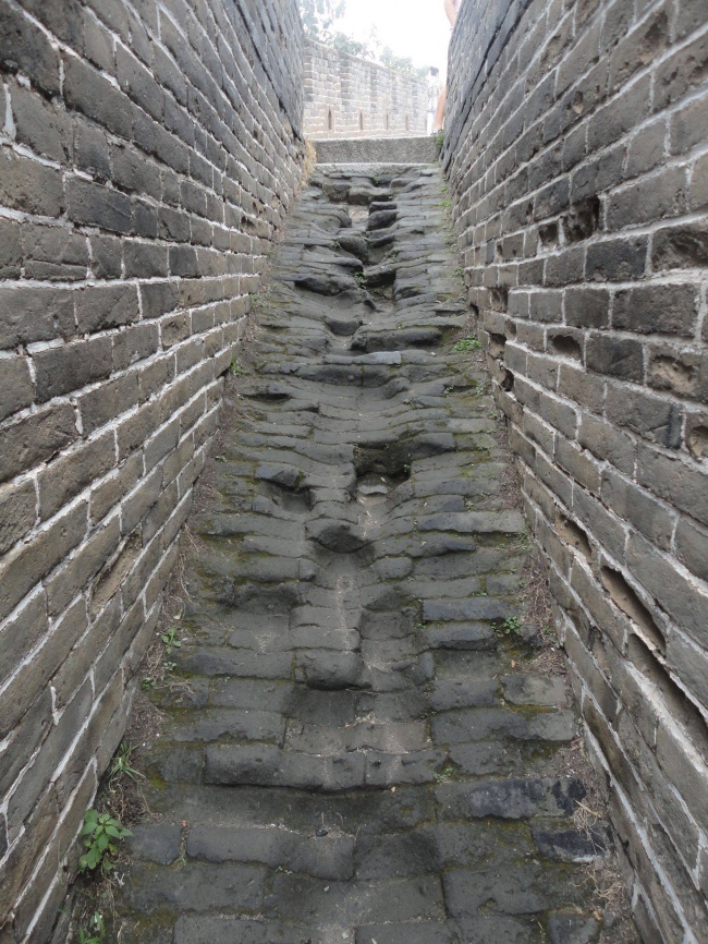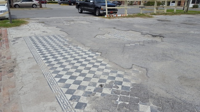 17. Traces of a former building in a parking lot. Instead of removing the tiles, workers just laid tarmac on top.
