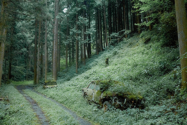6. Two abandoned cars that are gradually being swallowed up by the surrounding forest