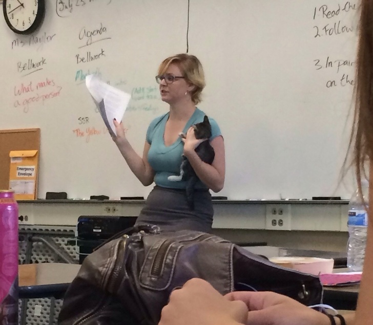 4. Four kittens were wandering around the school. This teacher caught one and went on teaching!