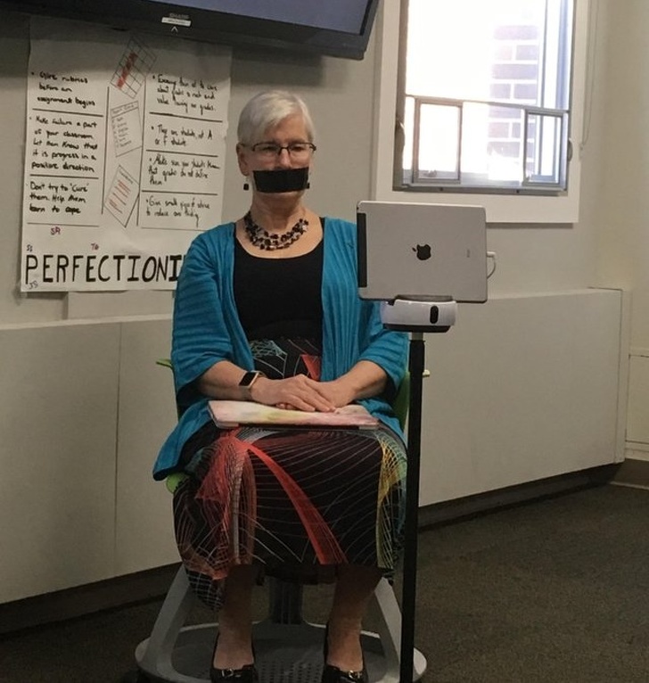 1. This teacher duct tapes her mouth during presentations to keep herself from interrupting her students.