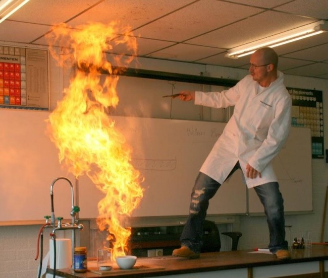 Most chemistry classes require demonstrations, but this guy takes them to a whole new level! Why settle for a simple Bunsen burner experiment when you can leap onto a work bench and show your class how it really should be done? Just make sure you don't set fire to the classroom!