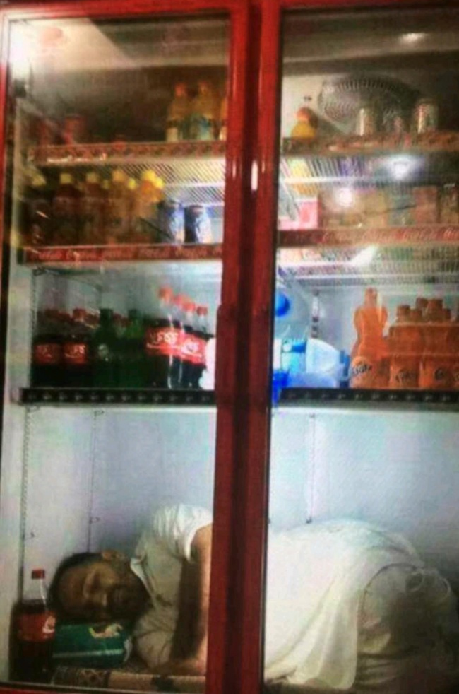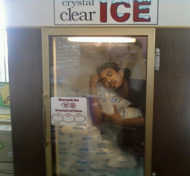 5. When it's so hot the only solution is to snuggle up with bags of ice in a freezer