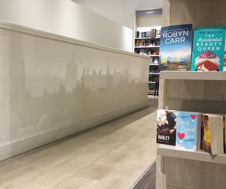 16. It looks like a city has been drawn on the wall, but it’s only a shadow in this library.