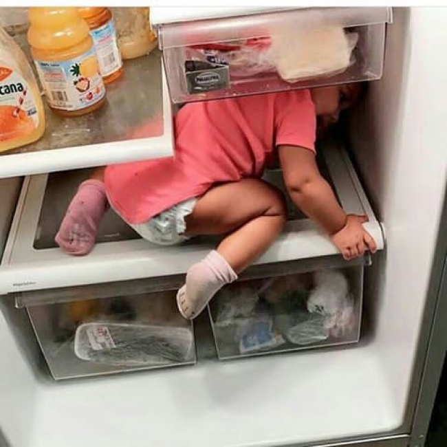 1. This little girl stole some candy when her mom wasn't looking and then hid in the fridge so she could secretly eat her stash!