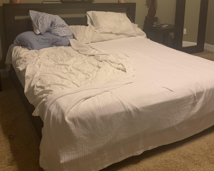 7. Her husband was angry with her, so only made half the bed!