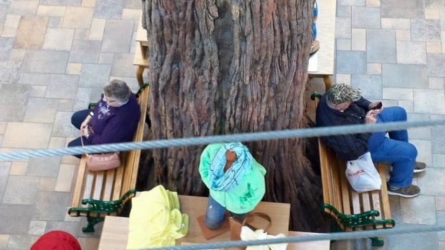 15. An elderly couple waiting for each other outside a mall...