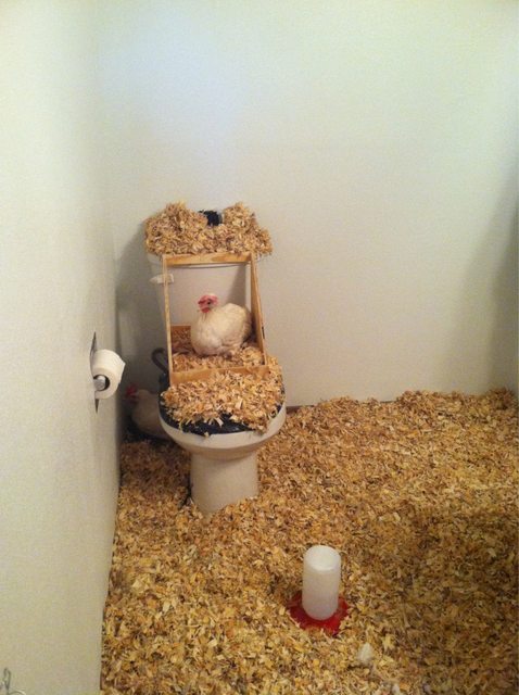 "For April Fool's day I decided to turn the bathroom into a chicken coop!"