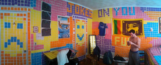 "My roommate's away this weekend, so I decorated his room with 5,000 Post-It's."