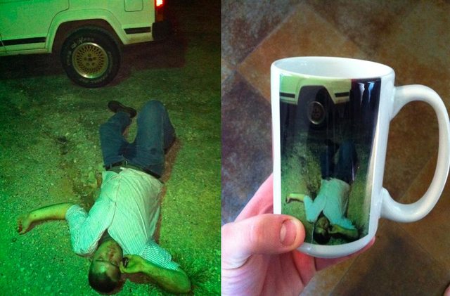 "Someone sent me a photo of my roommate passed out drunk after he peed himself... I immediately got it printed onto a mug, so that he would never forget."
