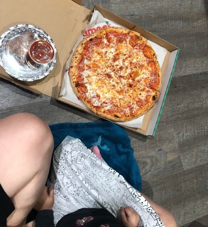 3. This woman enjoys her pizza after spending 4 years living on the street with a child, trying to find a place to live.