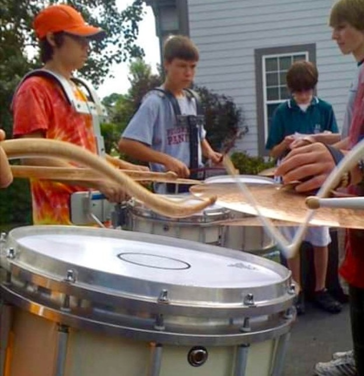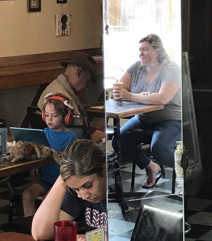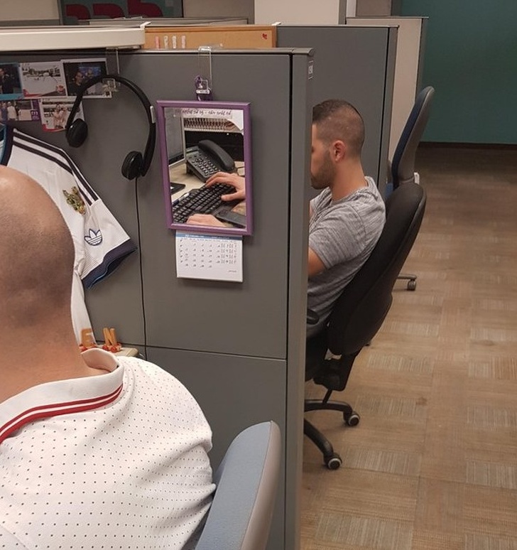 6. Is this a mirror or a window? The hands actually belong to the guy in the white shirt.