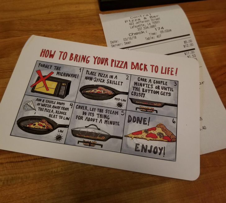 16. Ever wondered how to properly re-heat a pizza? Just follow the tips provided by this restaurant!