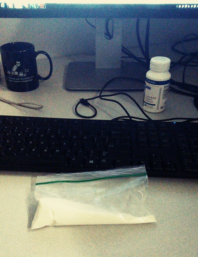If you’re hooked on coffee and various medications, you’ll look like an addict to your colleagues! Especially if you have fun bringing back strange powders (here, protein powder), in suspicious bags...
