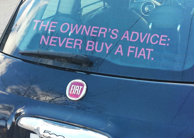 If you know something important, share it with as many people as you can. Knowledge is a weapon! Never forget that! Here, the owner of this Fiat is letting you know that you should never buy a Fiat!