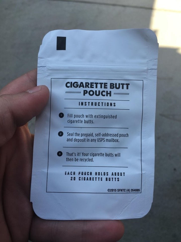 20. A pouch for cigarette butts that you then send off to address shown
