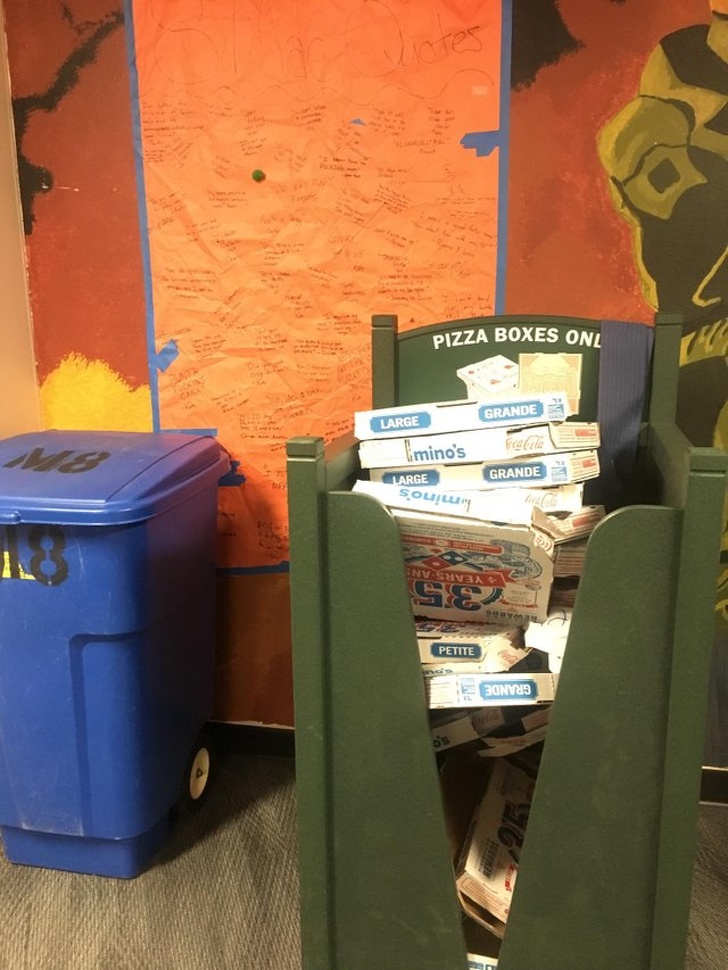 16. In this college there's a pizza box recycling bin