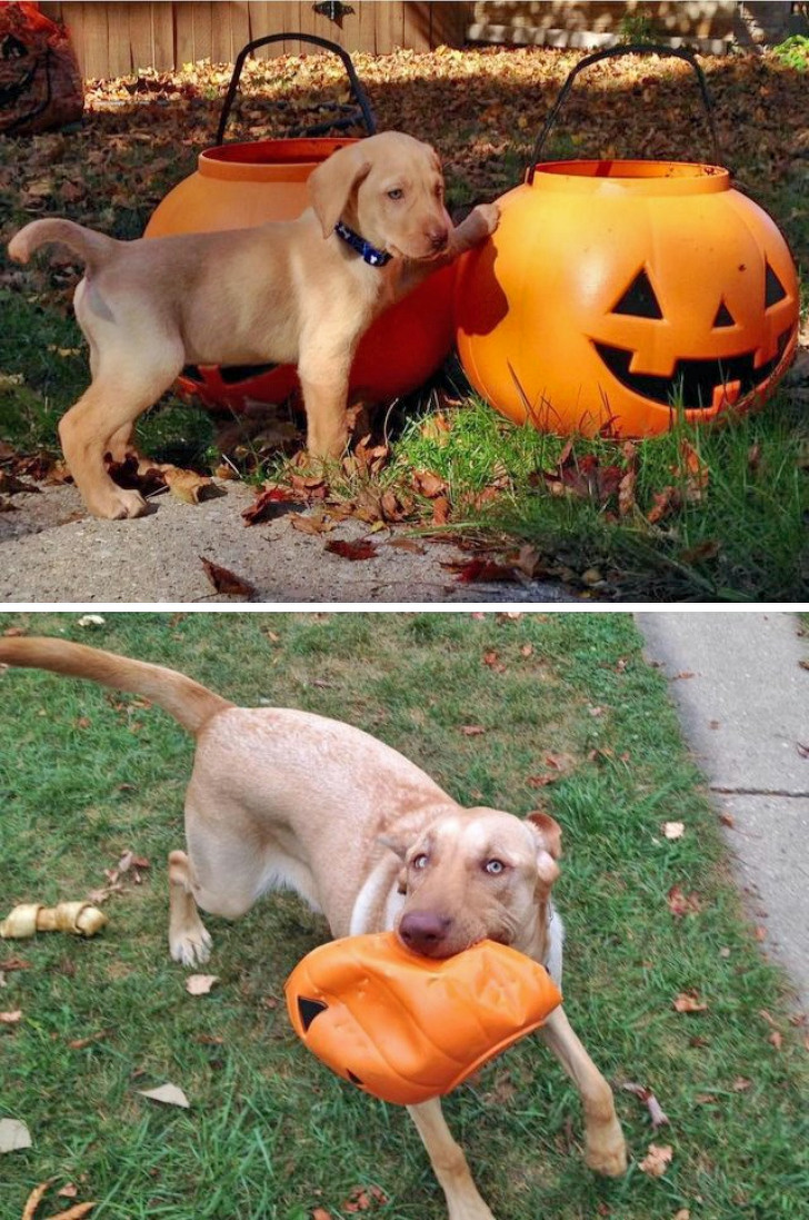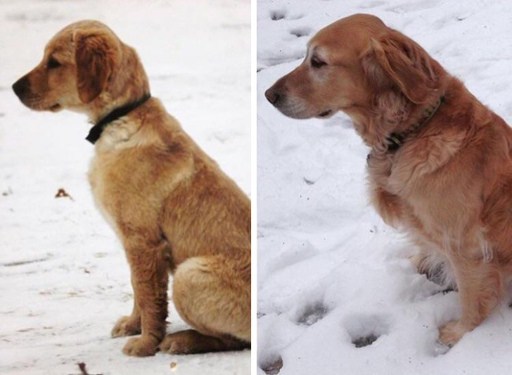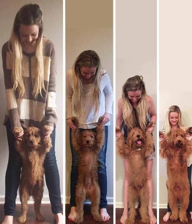 2. The woman hardly changes, and the dog doesn’t either...except maybe a little less rambunctious.