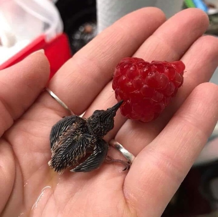 7. A hummingbird snacks on a raspberry