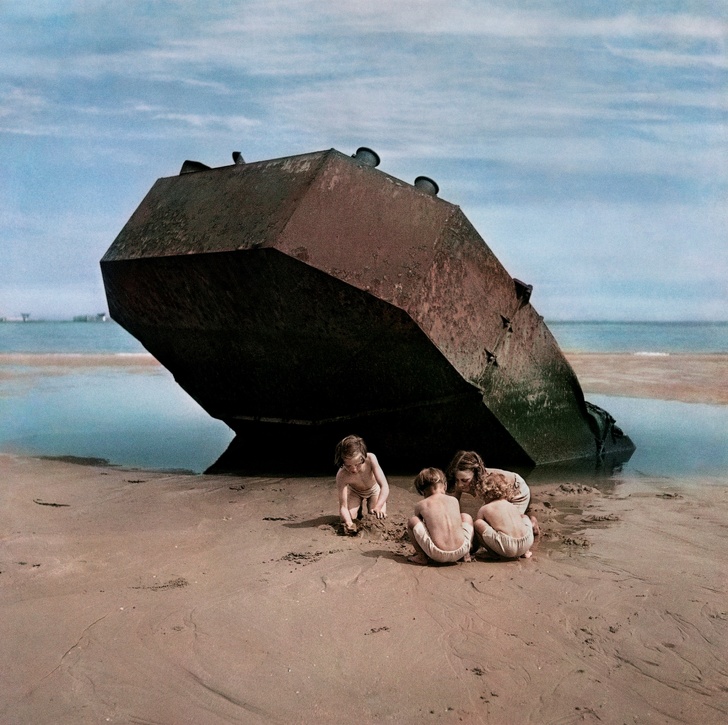 5. In 1947, children playing around the wreckage on Omaha Beach, Normandy