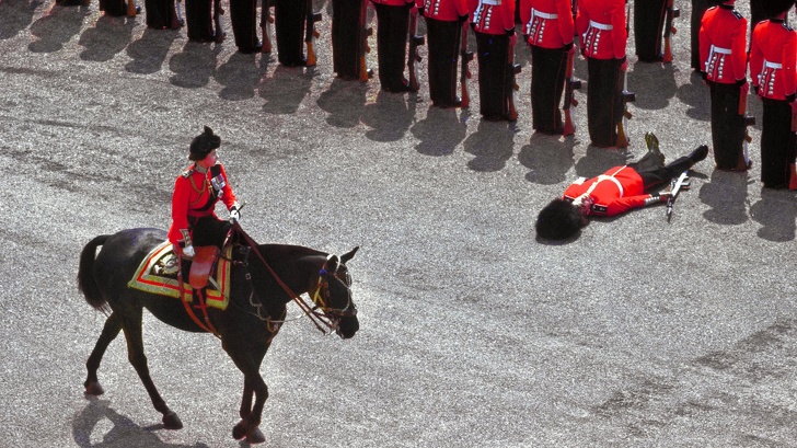1. In June 1970, a guard passes out as Queen Elizabeth rides past.
