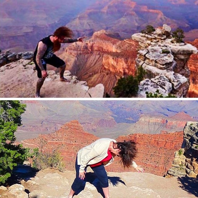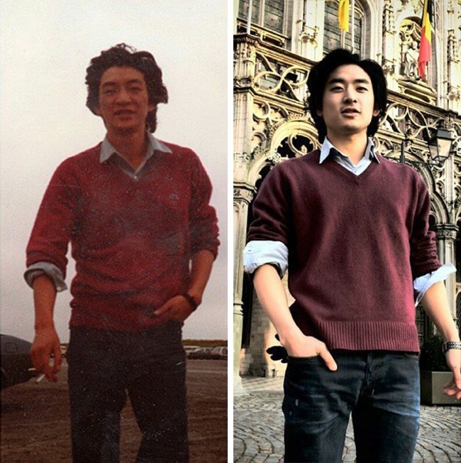 12. Photos of a father and son taken at the same age whilst wearing the same clothes!