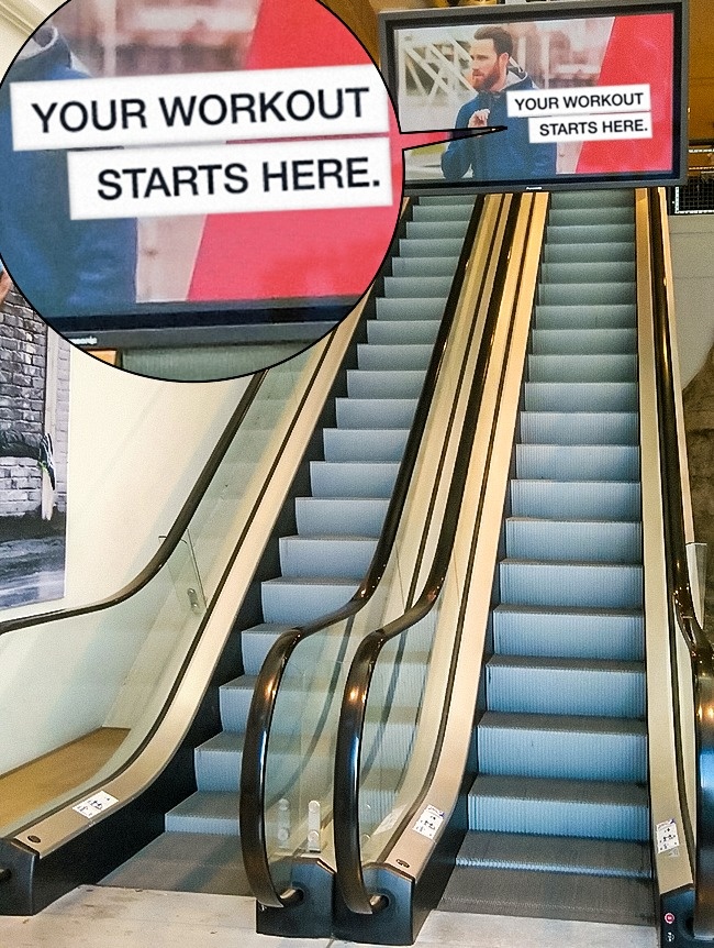 The escalators in this sports store were out of service, but the management was one step ahead of the game and decided to motivate their customers!