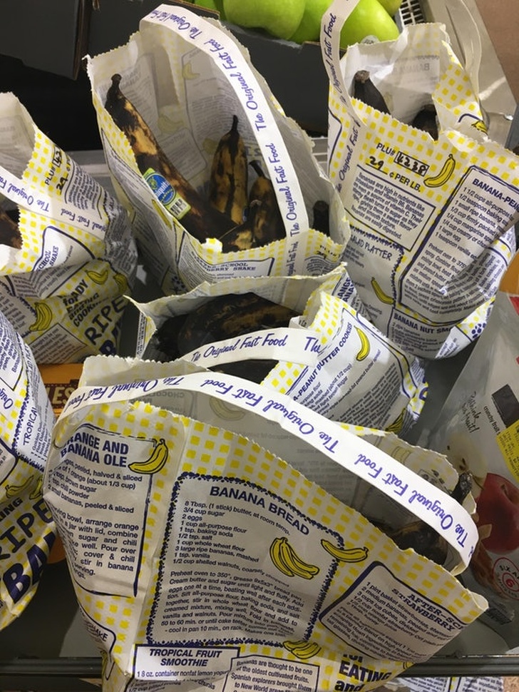 20. This store avoids waste by selling over ripe bananas cheaper and packages them in bags with a banana bread recipe!