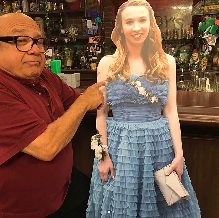 Fortunately she found a Danny DeVito cardboard on Amazon that cost a reasonable $100. She added a tie and boutonniere and then took him to the prom on a scooter. And to make things even funnier, she managed to keep her date a secret, although her family and closest friends knew what she was up to!