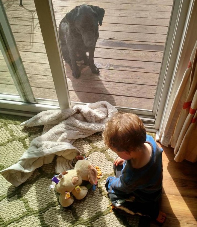 22. This little guy was so upset that he couldn't play outdoors with his dog that he sat down in front of the window and refused to budge