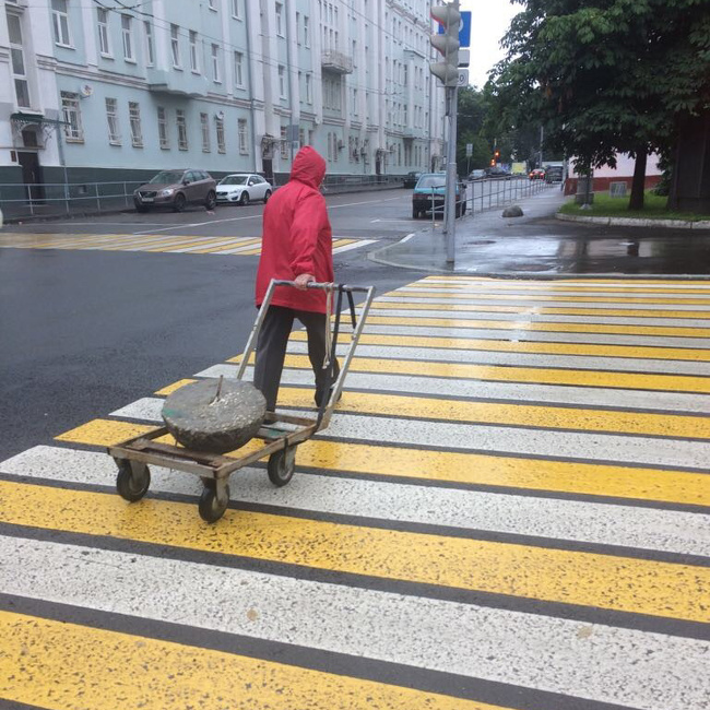 7. Just a woman wheeling a broken concrete sphere down the road... Any ideas what she plans to do with it?