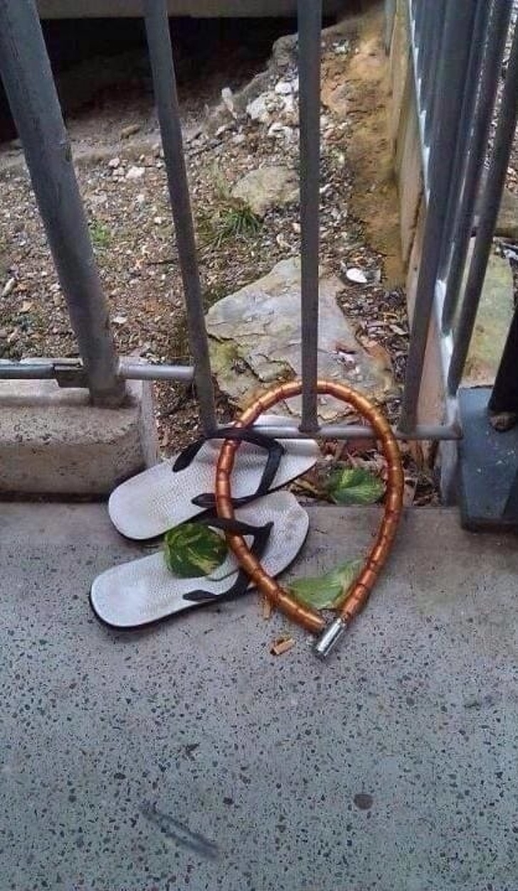 Why would anyone lock up their flip flops with a bike lock? Why would someone secure a toilet with a seat belt? Like us, you probably don't have the answers. So, you won't have much explanation for the photos below.